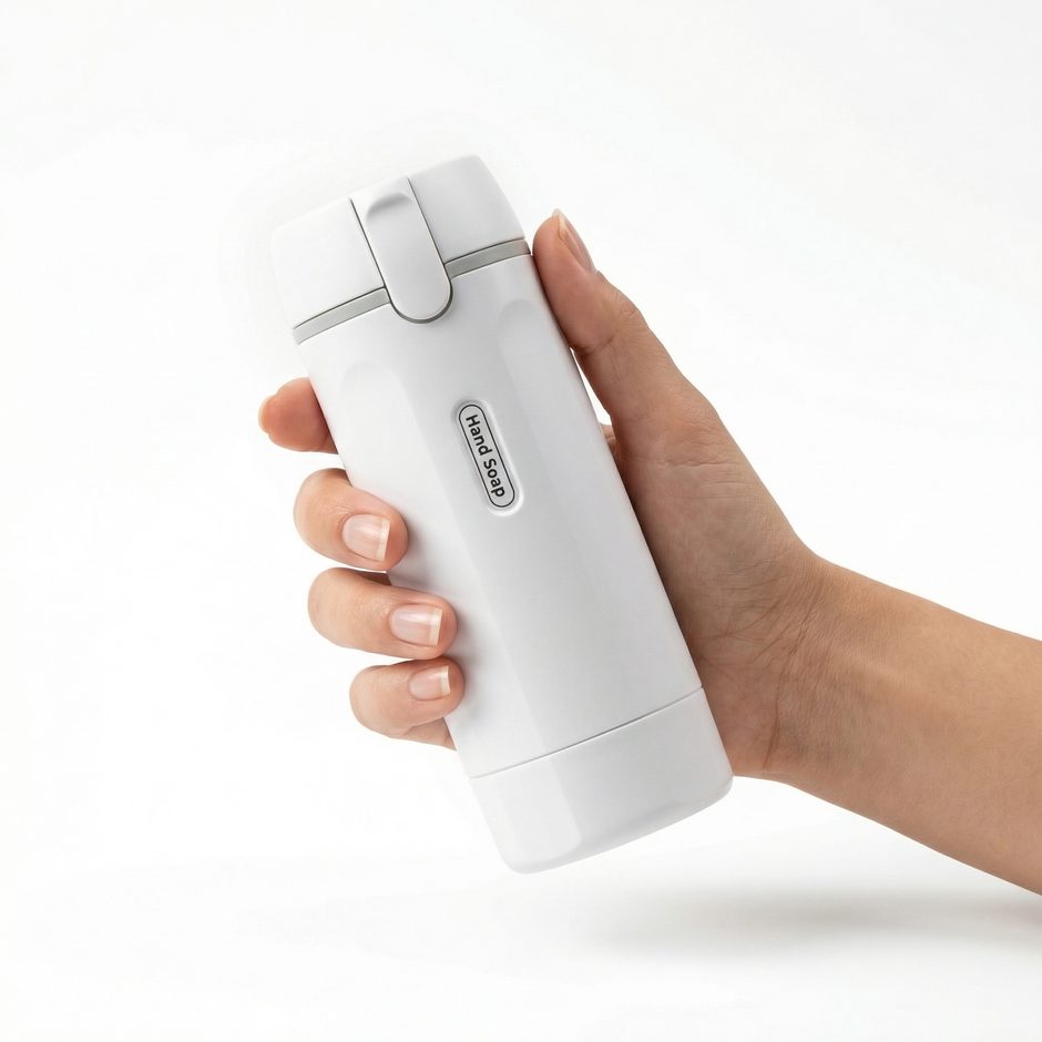Aus hochwertigem Kunststoff gefertigt, ist der 4-in-1 Reisespender leicht, langlebig und modern im Design.