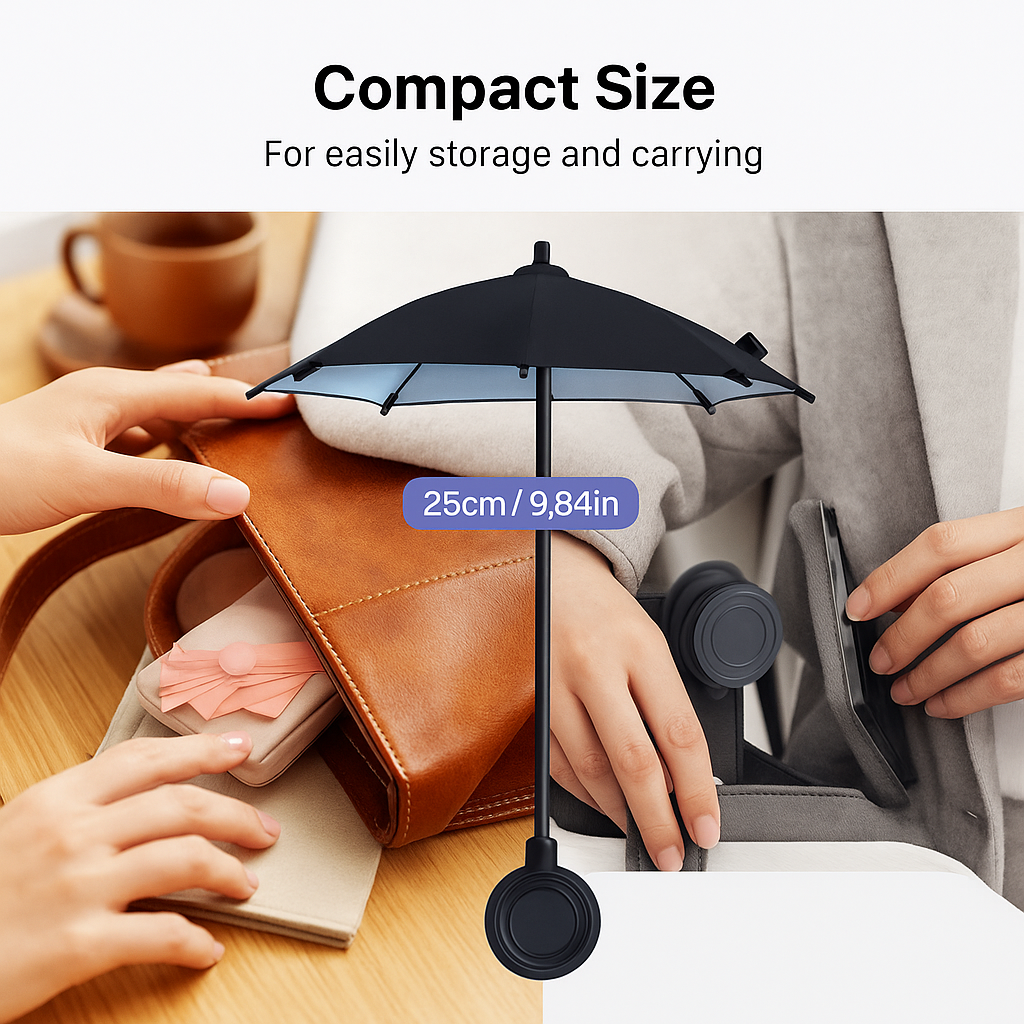 Schirm spendet Schatten – dein Handy bleibt kühl, Akku hält länger und das Gerät läuft stabiler.